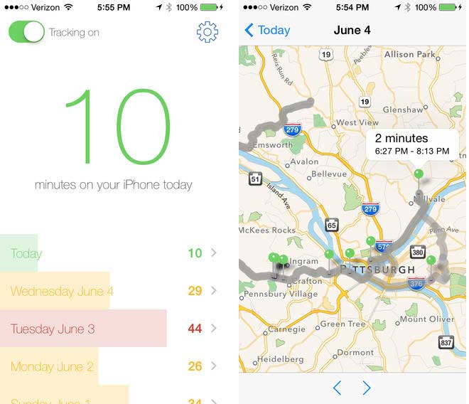 L’applicazione base è gratuita, funzionalità avanzate possono eventualmente essere sbloccate con gli acquisti in-app. Al primo avvio basta muovere lo switch su “I’m using my iPhone”; dalle impostazioni si può scegliere se tracciare o no i luoghi e gli orari (inizio e fine) nei quali tenere conto del tracking (è necessario consentire l’accesso alle funzioni di localizzazione e all’individuazione della posizione attuale).