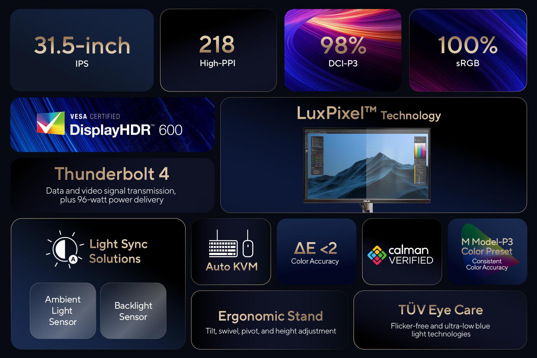 Una tecnologia denominata Asus Light Sync, sfrutta due sensori che, secondo il produttore, garantiscono immagini “straordinariamente luminose” ed una temperatura del colore più accurata. Un sensore di retroilluminazione si attiva automaticamente all’avvio dello schermo; un sensore di luce ambientale regola automaticamente la gamma di colori del monitor in base all’illuminazione ambientale.