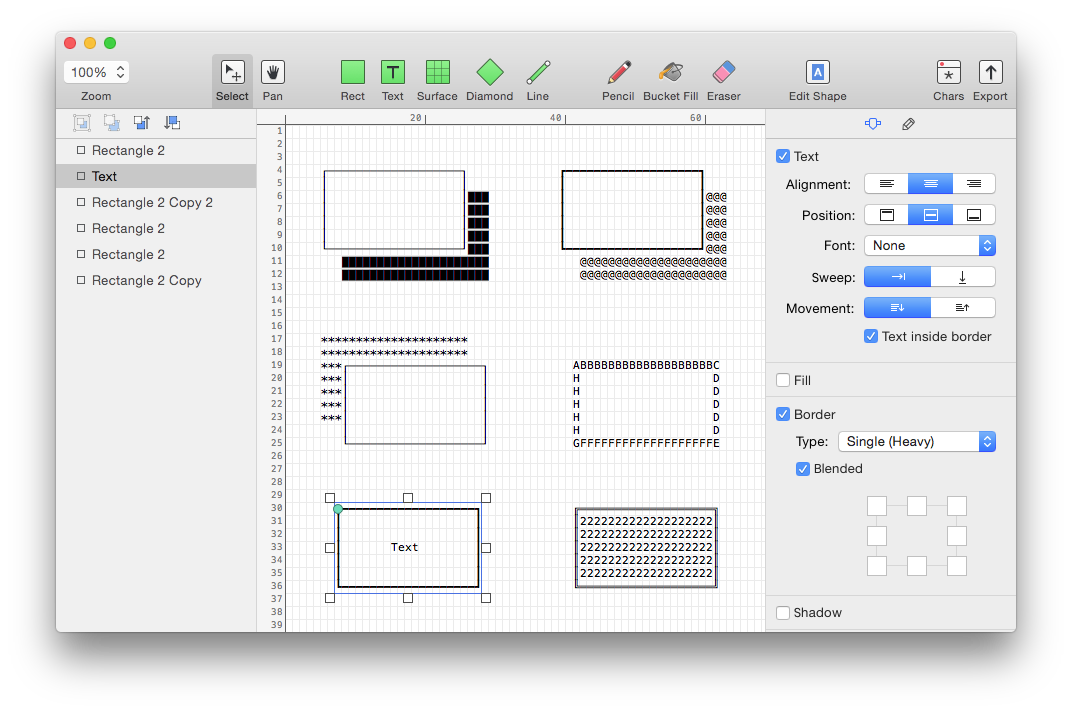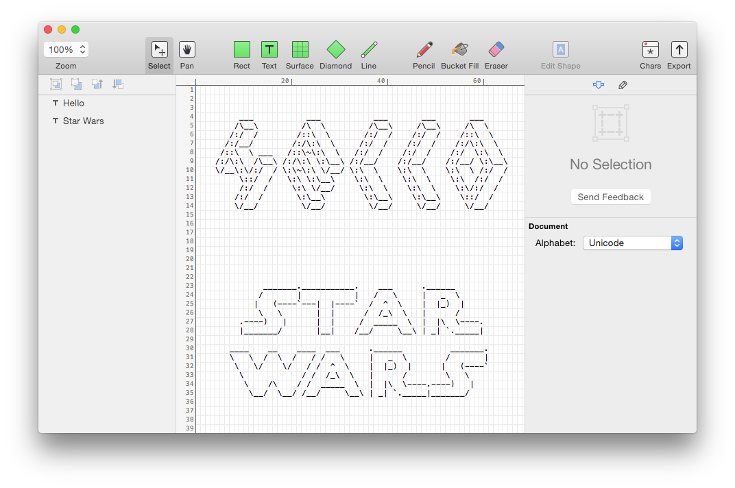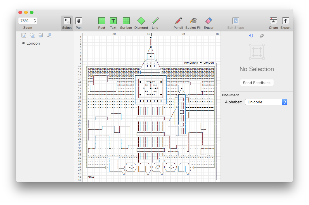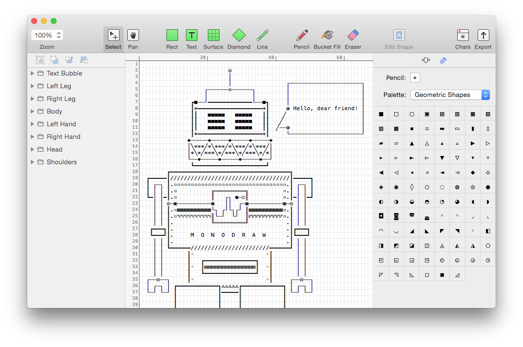 Monodraw è un editor di nuova generazione che permette di disegnare sfruttando i caratteri ASCII; mette a disposizione funzioni avanzate con le quali è possibile disegnare rettangoli e linee scegliendo vari stili. Non mancano strumenti per il riempimento di aree, allineare gruppi di oggetti, spostare “sopra” e “sotto” elementi, nasconderli. L’applicazione permette di ingrandire a piacere la vista del documento, selezionare caratteri e simboli da comode palette, importare un’immagine da usare come velina e ovviamente salvare il tutto in formato testo puro.