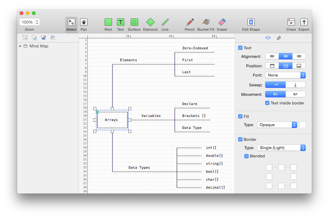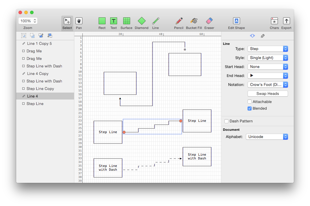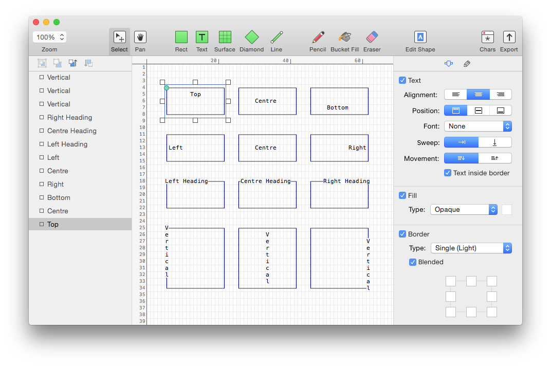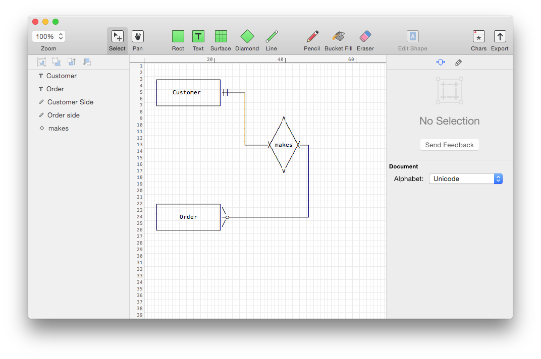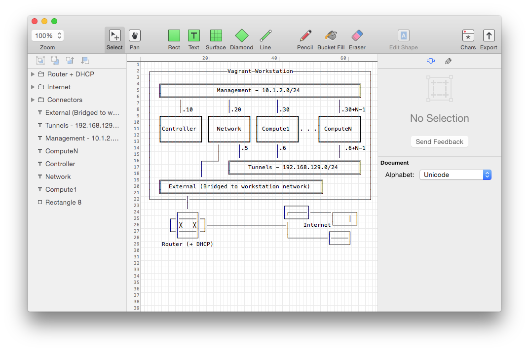 Monodraw è un editor di nuova generazione che permette di disegnare sfruttando i caratteri ASCII; mette a disposizione funzioni avanzate con le quali è possibile disegnare rettangoli e linee scegliendo vari stili. Non mancano strumenti per il riempimento di aree, allineare gruppi di oggetti, spostare “sopra” e “sotto” elementi, nasconderli. L’applicazione permette di ingrandire a piacere la vista del documento, selezionare caratteri e simboli da comode palette, importare un’immagine da usare come velina e ovviamente salvare il tutto in formato testo puro.
