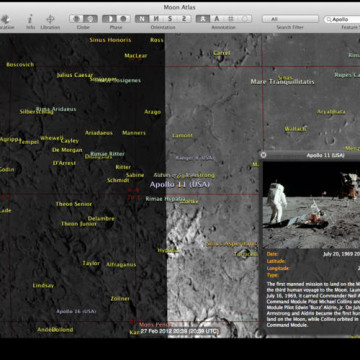 Moon Atlas è un’applicazione utile per gli appassionati di astronomia con la quale è possibile esplorare in 3D la superfice del satellite naturale della Terra. È possibile “navigare” e ingrandire dettagli, visualizzare specifici punti e sezioni, cercare elementi all’interno di un database con varie opzioni.