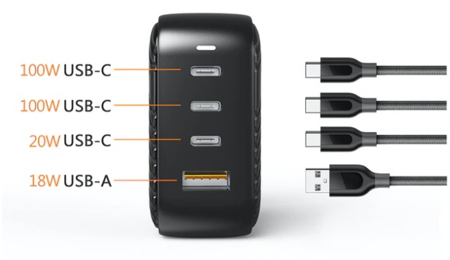 La prima uscita USB-C1 a 100 W max, garantisce potenze di erogazione PD 5V/3A, 9V/3A, 12V/3A, 15V/3A, 20/5 A, PPS 3,3 V-16 V/5A. La seconda USB-C2, sempre 100 W, offre ricarica con support PD 5V/3A, 9V/3A, 12V/3A, 15V/3A, 20/5 A, PPS 3,3 V-16V/5A, mentre la terza, 20W massimo, PD 5V/3A, 9V/ 2,22 A, 12 V/1,66A. La porta USB-A1, invece, fornisce un massimo di 18 W, a 5V/3A, 9V/2A, 12V/1,5A. In pratica è possibile ricaricare iPhone, iPad, MacBook Pro 16″ e anche un altro dispositivo tutti in contemporanea senza problemi.