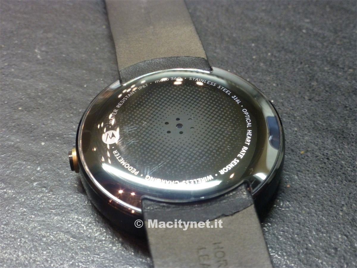 Proprio per lo spessore, ma anche le dimensioni, il Moto 360 al polso risulta un po’ impegnativo, soprattutto sui polsi femminili e quelli sottili in generale, a causa del diametro non trascurabile di 46 mm: la cassa in acciaio, perfettamente circolare, ospita uno schermo LCD a colori da 1,56 pollici con una risoluzione di 205 punti per pollice: durante il breve giro di test i colori visualizzati, luminosità e definizione ci hanno convinto.