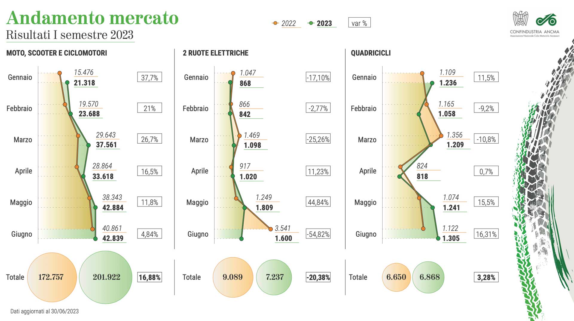 Splende il sole sull’estate delle due ruote a motore. I dati di mercato diffusi da Confindustria ANCMA (Associazione Nazionale Ciclo Motociclo Accessori) confermano l’interesse crescente degli italiani verso moto, scooter e ciclomotori e certificano un primo semestre 2023 che vola a +16,8% sull’anno scorso.