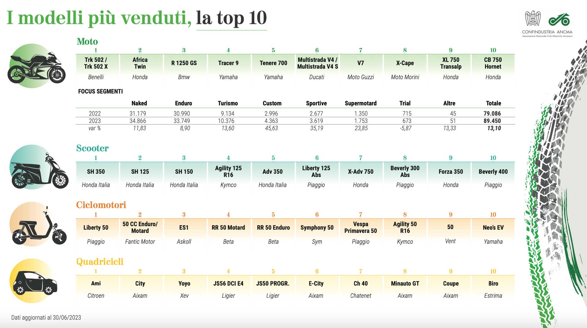 I primi sei mesi dell’anno evidenziano una crescita a doppia cifra del mercato due ruote: +16,88% e 201.922 pezzi venduti. Di tutto rilievo la performance degli scooter, che incassano un quarto dei volumi in più rispetto al primo semestre 2022 (+24,93%) e targano 102.470 mezzi. A doppia cifra anche l’incremento delle moto: +13,10% e 89.450 unità, mentre i ciclomotori, per effetto di quattro mensilità negative nel corso dell’anno, si fermano a -14,14% e 10.002 veicoli immessi sul mercato.