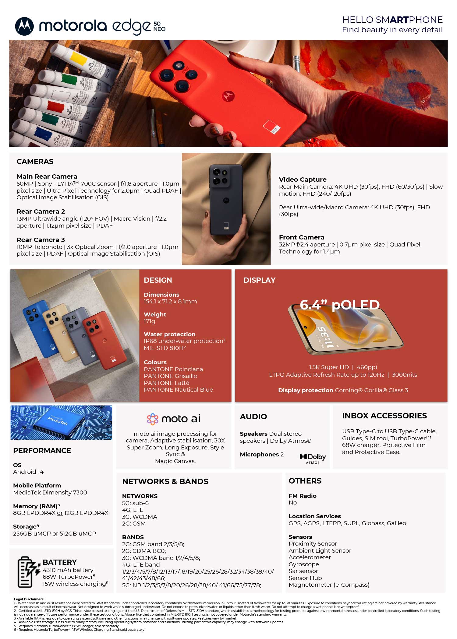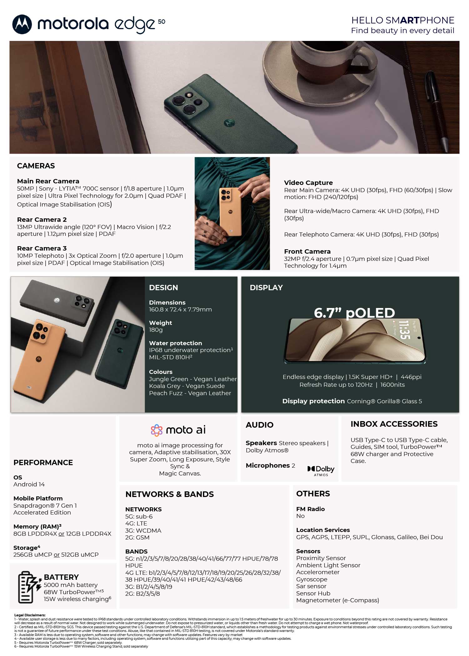 motorola edge 50 vanta altoparlanti stereo Dolby Atmos. È alimentato dal processore Snapdragon 7 Gen 1 Accelerated Edition con supporto 5G e Wi-Fi 6E, con 12 GB di RAM e 512 GB di memoria interna, con tecnologia RAM Boost e gestione termica avanzata. La batteria da 5000 mAh secondo il rpoduttore offre un’autonomia per tutto il giorno, supportata dalla ricarica TurboPower da 68 W e dalla ricarica wireless da 15 W.