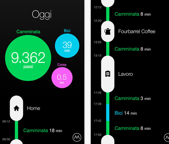 Moves è certamente una delle applicazioni preferite dagli amanti del fitness e del benessere fisico. Al di là di un’interfaccia grafica particolarmente piacevole e minimalista in pieno stile iOS 7, l’applicazione sfrutta ora al massimo le nuove potenzialità del coprocessore M7 di Apple per seguire automaticamente la propria attività fisica quotidiana, gli spostamenti per andare da casa al lavoro e il tempo passato in luoghi importanti. Il tutto, mentre si tiene comodamente il telefono in tasca o in borsa.