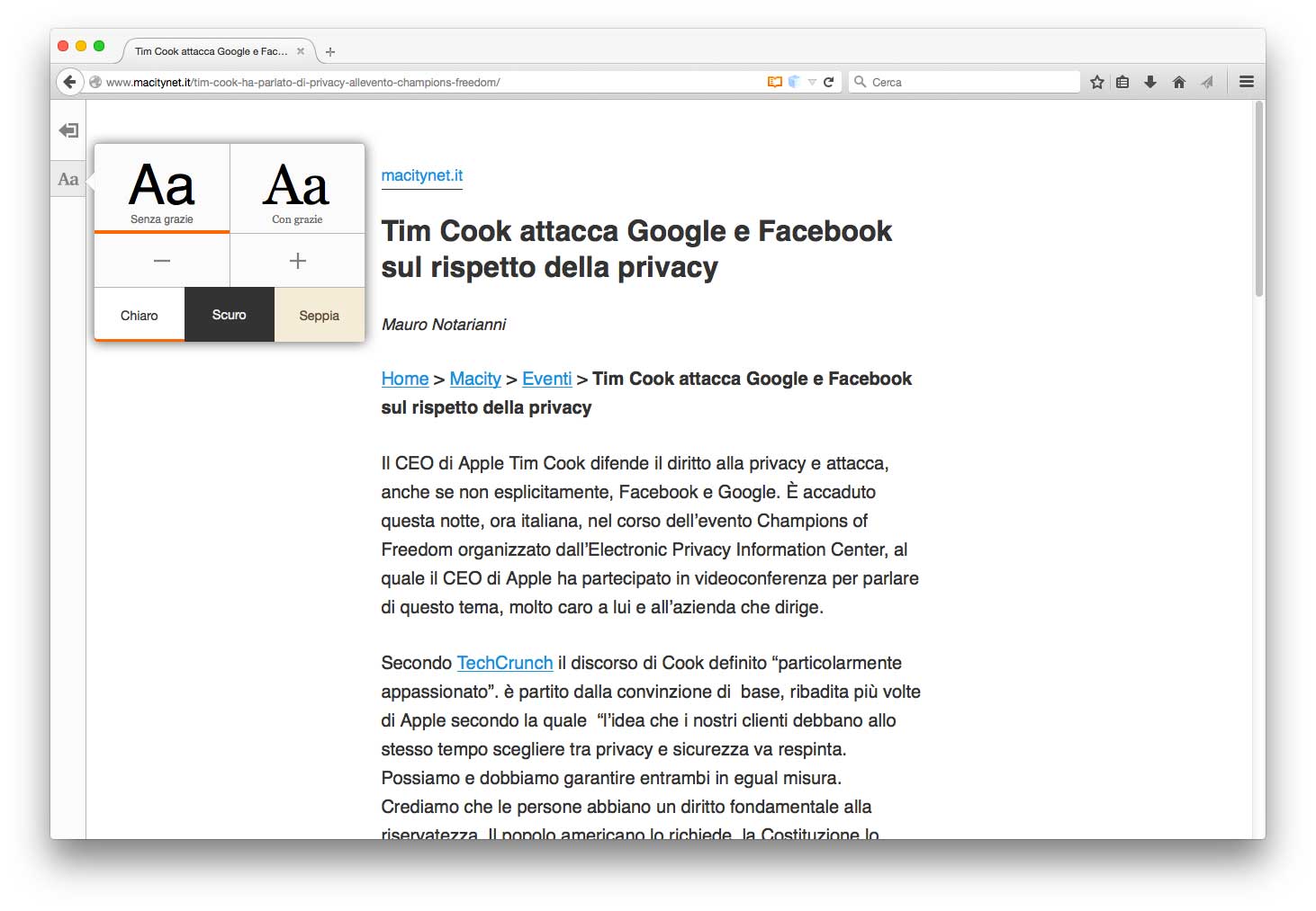 Mozilla continua ad aggiornare Firefox integrando novità minori ma sempre interessanti. Nell’ultima release 38.0.5 è stata integrata la Modalità Lettura, funzione simile all’equivalente presente in Safari che consente di visualizzare le pagine web eliminando tutto ciò che è superfluo evidenziando principalmente il testo da leggere. Facendo click sul pulsante, una piccola icona a forma di libro a destra dell’URL visualizzato in quel momento, sparisce la visualizzazione attuale per mostrare solo il testo semplice su uno sfondo bianco di facile lettura. Grazie alle icone dedicate a sinistra della videata è possibile uscire da tale modalità e controllare la modalità di visualizzazione dei caratteri (con grazie, senza grazie, più grande, più piccolo, sfondo chiaro, scuro o seppia).