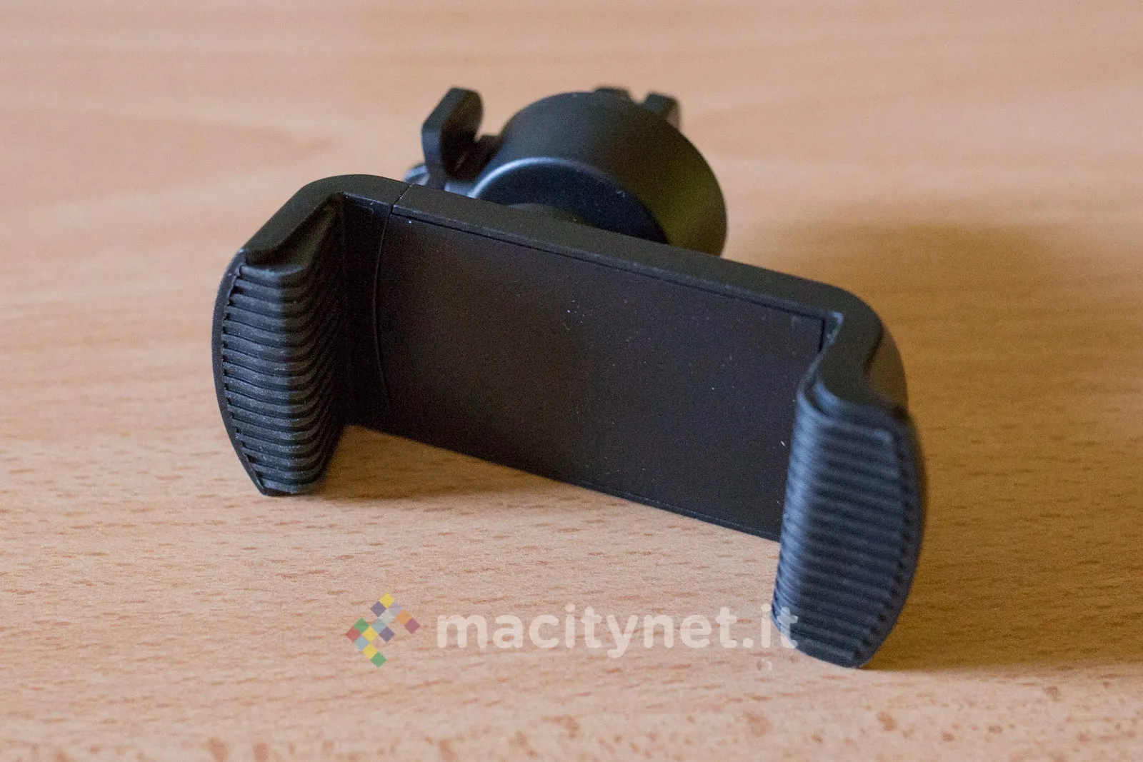 La stabilità del supporto è ulteriormente rafforzata da una copertura in gomma che ricopre la superficie a contatto con il resto della griglia. La clip predisposta per l’aggancio dello smartphone è collegata alla morsa attraverso una piccola testa a sfera che permette di orientare il telefono in qualsiasi posizione, orizzontale e verticale, oltre che di inclinarlo leggermente (circa 30 gradi) in tutte le direzioni, potendo così adattarne la fruibilità dello schermo del telefono tanto per il guidatore, quanto per il passeggero al suo fianco, pur mantenendo il sistema bloccato ad una delle griglie al centro dell’abitacolo.