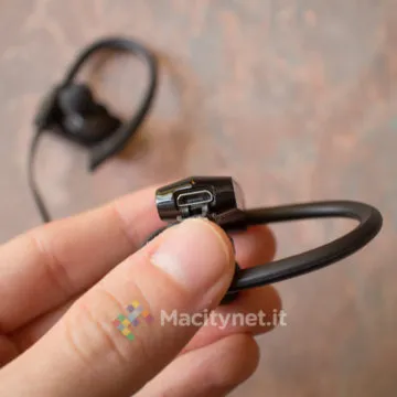 Non sono tra le più leggere: sulla nostra bilancia da cucina pesano 20 grammi, 5 grammi più di altre cuffie sportive che abbiamo provato in passato, un aumento certamente dettato dalla presenza dei due archetti anche se, all’atto pratico, la differenza con le altre in questo senso non si nota. Non ci è invece piaciuto il cavo, lungo 54 centimetri, davvero troppi considerando che andrà a scendere dietro la nuca e in qualche caso, come spiegheremo più avanti, potrebbe risultare scomodo.