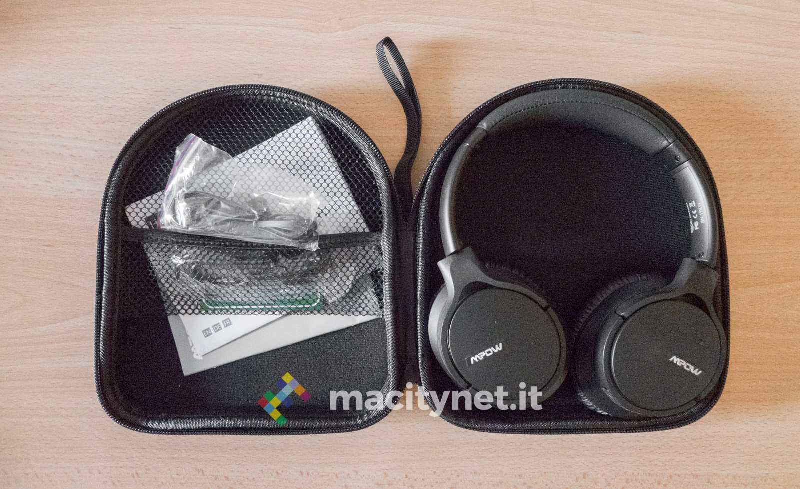 Se da un lato troviamo le cuffie, l’altra metà della custodia è occupata da una tasca traforata contenente il cavo di ricarica, un cavo jack da 3.5mm per il collegamento via cavo e il libretto delle istruzioni.
