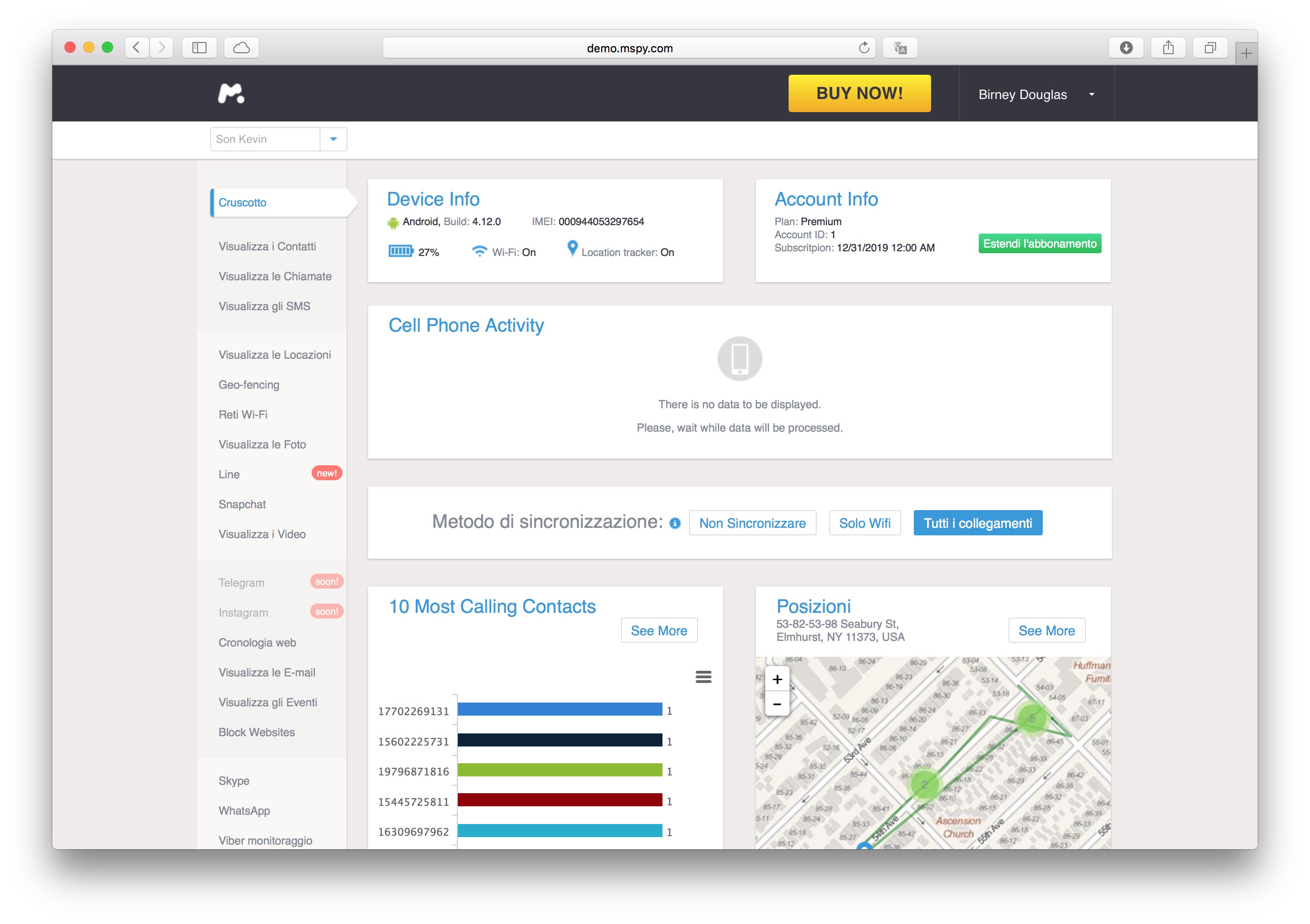 Completati i pochi e semplici passaggi per preparare il sistema al monitoraggio di uno o più dispositivi, non resta che spulciare la web-app contenente tutte le informazioni ben organizzate in apposite sezioni. Per ogni dispositivo si può avere una panoramica delle operazioni più comuni attraverso il Cruscotto, dove sono raccolti gli spostamenti sulla mappa, con un riepilogo delle attività e delle telefonate più frequenti.