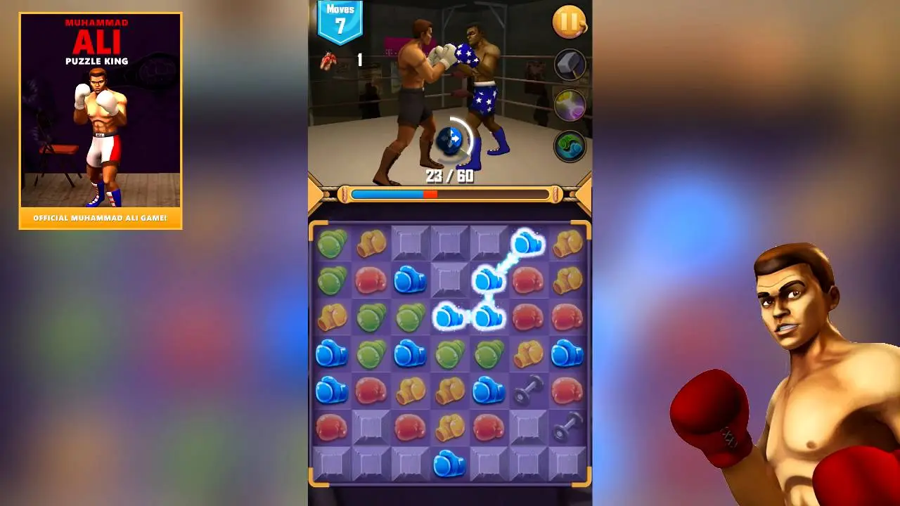 Ovviamente, trattandosi di un gioco su licenza ufficiale non mancheranno disegni e grafiche in grado di richiamare da vicino il più grande dei pugili, potendo anche contare su una storia di sottofondo, grazie alla quale rivivere il percorso che ha portato Muhammad Ali a diventare un campione. Mentre sulla parte bassa dello schermo si manifesta il gameplay principale, quello in cui accoppiare elementi e liberare la griglia, sulla parte alta si potrà assistere a uno scontro tra pugili, il cui andamento risentirà ovviamente delle mosse messe a segno nella griglia in basso.