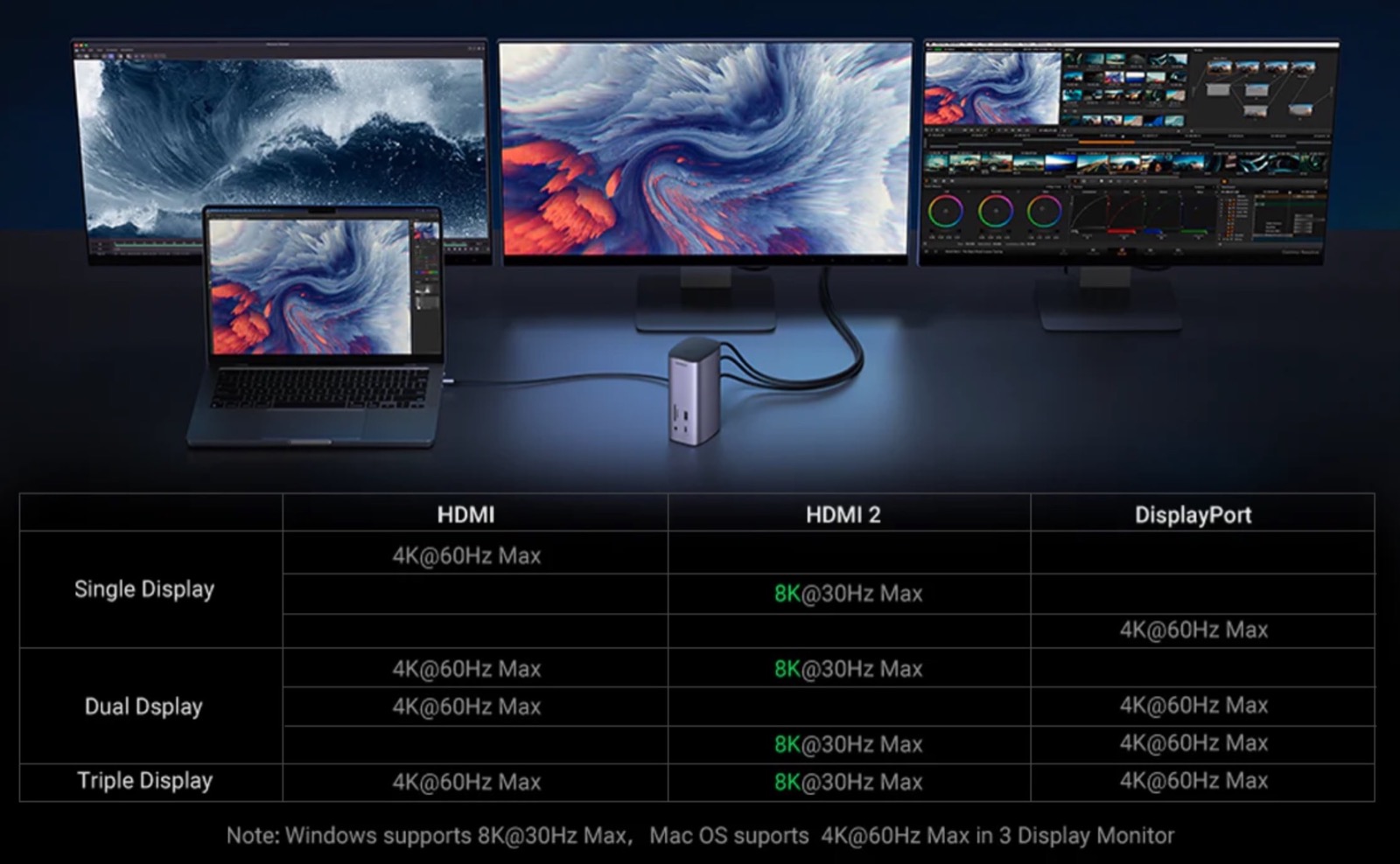 Si accende pigiando il pulsante superiore e in un lampo tutte le tredici porte sono attive e disponibili all’uso. Come dicevamo si possono collegare fino a tre monitor esterni insieme (qui sotto la tabella delle combinazioni possibili) e fino a quattro dischi HDD da 3,5″ esterni su cui lavorare contemporaneamente.