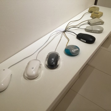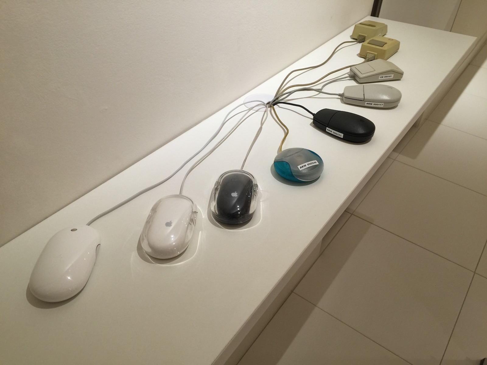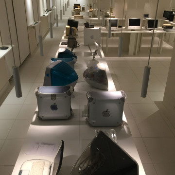 Quando si entra nella nuova sede del museo AllAboutApple, si ha un impatto emozionale molto forte. Tutto – i materiali scelti come il vetro e il legno, l’uso del bianco sopra tutti gli altri colori, la cura per i dettagli – parla di Apple. L’allestimento, realizzato dall’architetto Luigi Lorenzini, non è un omaggio agli Apple Store, ma alla storia dell’azienda di Cupertino e al design made in California che è noto in tutto il mondo. Il visitatore si troverà dentro una dimensione suggestiva, gli sembrerà di essere immerso in un passato non molto lontano che ha messo le basi per il futuro: la storia di una tecnologia primitiva che però è ancora così attuale. E proverà questa sensazione guardando sulle pareti i poster e le insegne, osservando i diversi modellini di mouse, guardando i computer che hanno dettato la storia dell’informatica e del personal computer.