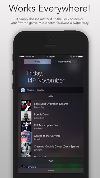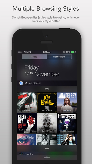 Con Music Center gratis per iOS non occorre più sbloccare iPhone o iPad e lanciare l’app Musica per scegliere la canzone da riprodurre. Grazie a questo widget infatti basta tirare verso il basso la schermata del nostro dispositivo iOS e far comparire il Centro Notifiche: Music Center visualizza la nostra intera libreria musicale memorizzata sul dispositivo.