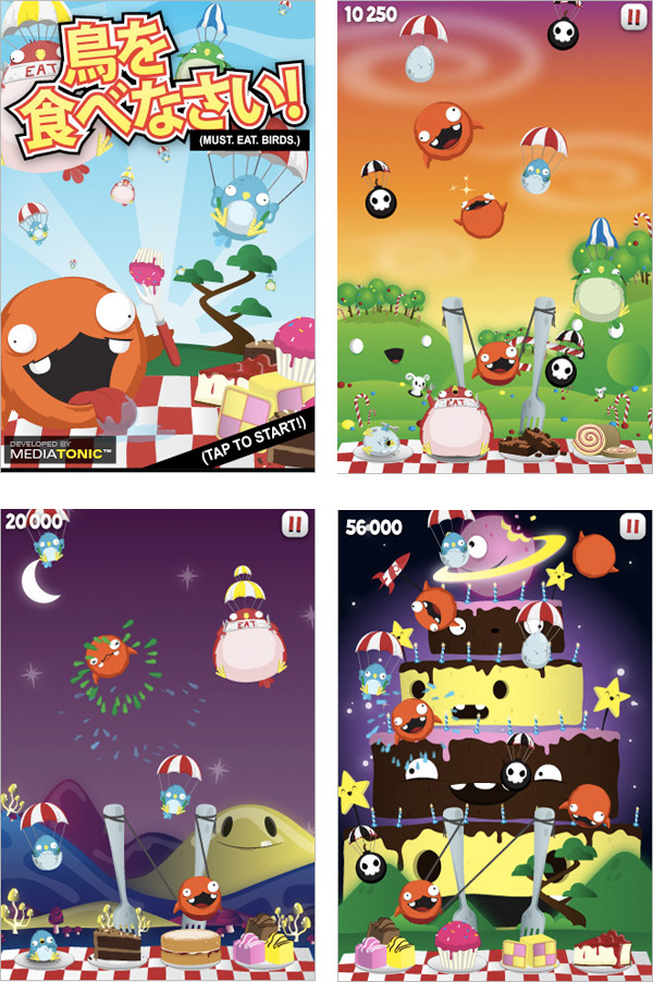 Must.Eat.Birds è uno dei giochi d’azione più originali e divertenti al momento disponibili su App Store. Il giocatore è chiamato ad azionare una improvvisata fionda costruita con due forchette: con il dito trasciniamo indietro l’elastico per regolare la forza e anche la direzione del tiro, poi lasciamo andare per proiettare in aria Nomster, un mostro spugnoso e tondeggiante dallo sguardo un po’ fesso ma senza dubbio simpatico. Con i nostri lanci dobbiamo indirizzare il mostro in modo che possa interccettare e inghiottire gli uccelli e gli altri nemici che dall’alto tentano di paracadutarsi sul nostro gustoso picnic. Lo scopo del gioco è appunto quello di eliminare il maggior numero possibile di nemici prima che questi possano raggiungere il picnic in fondo allo schermo mangiandosi tutte le prelibatezze.