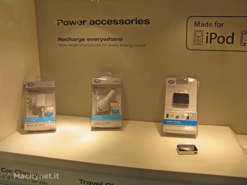 In questa vetrina sono esposti gli alimentatori certificati da Apple per iPhone, iPad e iPod di SBS per la ricarica dalla presa della corrente e anche per l’accendisigari per auto. Quest’ultimo è disponibile anche in versione micro. A sinistra la batteria esterna per una ricarica supplementare in viaggio