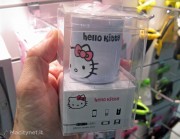 Uno scatto ravvicinato dello speaker esterno Hello Kitty: la batteria integrata si ricarica in 3 ore ed offre una autonomia di ascolto di 4-6 ore. Il collegamento è tramite jack da 3,5 mm