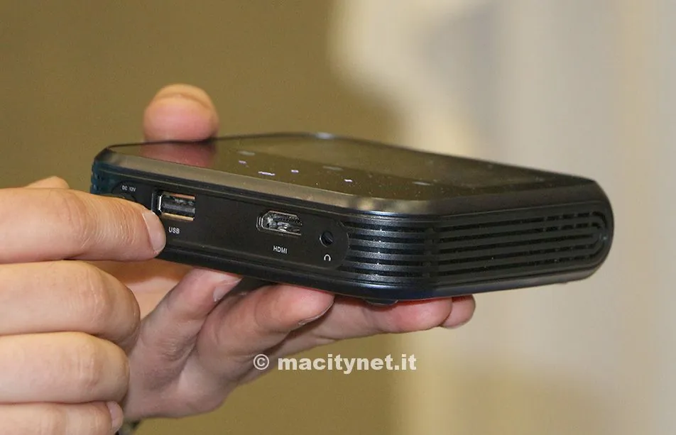 Il proiettore è di piccole dimensioni (la batteria è integrata). Sul versante delle connessioni troviamo: porta di alimentazione 12V, porta USB (utilizzabile anche per ricaricare altri dispositivi), HDMI. Sulla parte posteriore troviamo la filettatura standard Withworth e un piedino inclinabile. Manca lo zoom ma è presente una ghiera per la messa a fuoco. Dai controlli touch è possibile richiamare volume. Il dispositivo sarà in distribuzione per la prossima estate; il prezzo non è stato comunicato.