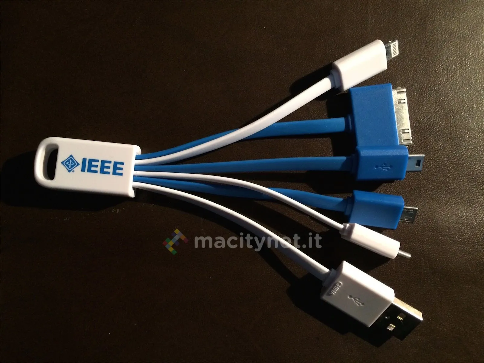 Si tratta del cavetto tuttofare USB che vedete nelle foto riportate in questo articolo, regalato in alcuni stand di costruttori e società che esponevano a MWC16, tra cui anche la IEEE, sigla di Institute of Electrical and Electronics Engineers, l’associazione internazionale che propone e ratifica tutti gli standard tecnologici più importanti. La versione del cavetto tuttofare IEEE è visibile nelle foto di questo articolo ma in circolazione in fiera è stato avvistato anche un modello di Intel.