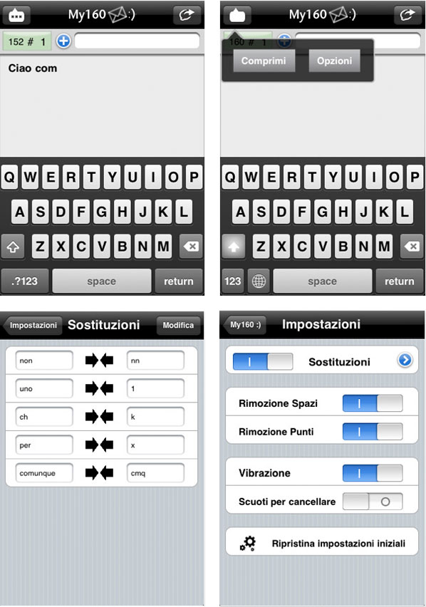 my160 rimuove gli spazi trasformando la prima lettera della parola in maiuscole, per mantenere la leggibilità , per esempio la frase “Ciao come stai?” viene trasformata in “CiaoComeStai?”. Inoltre è possibile eseguire una sostituzione personalizzata di alcune parole all’interno dell’SMS, così premendo un solo pulsante è possibile trasformare “perché” in “xché”. Dal pannello delle impostazioni di my160 è possibile inserire il carattere o la parola originale indicando poi al software la versione abbreviata. Infine my160 è in grado di eliminare o ridurre la punteggiatura superflua.