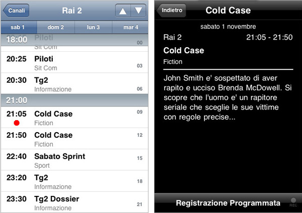 Con My Tv trasformiamo iPhone e iPod touch in due completissime guide ai programmi televisivi. Oltre a visualizzare i palinsesti completi di 4 giorni il programma sviluppato da Emanuele Fornaro memorizza i dati permettendone così la consultazione anche in assenza di collegamento Web o Wi-Fi, infine permette di visualizzare per fascia orario, per canale. Questo per qualsiasi canale presente in Italia che sia terrestre, digitale e persino satellitare.