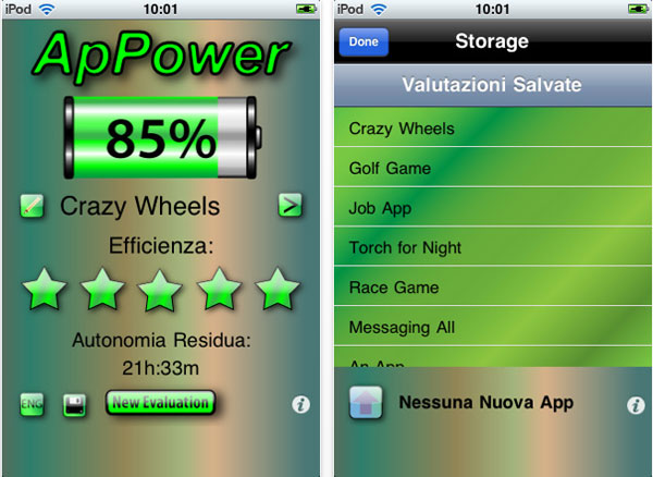ApPower è un interessante applicativo che misura l’efficienza energetica dei giochi e dei programmi che utilizziamo più spesso su iPhone e touch. Una volta stabilito quanto consumano i giochi possiamo programmare meglio l’utilizzo di iPhone per evitare di rimanere senza carica durante un viaggio o una trasferta.