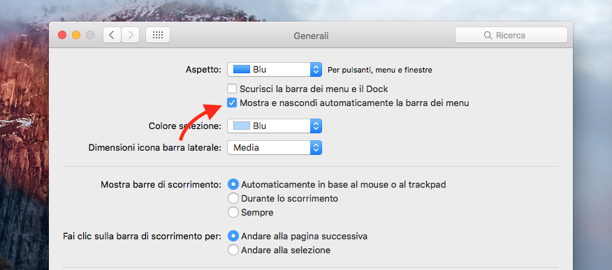 A questo punto, all’interno del pannello Generali sarà sufficiente selezionare la casella “Mostra e nascondi automaticamente la barra dei menù”, indicata dalla freccia rossa nell’immagine in basso. Dopo aver selezionato questa opzione, la barra dei menù in alto sarà visibile solo quando l’utente passerà il cursore del mouse sulla parte superiore dello schermo.