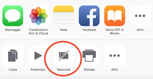 All’interno del menù così aperto, sarà necessario scegliere la nuova opzione nascondi, mostrata nell’immagine in basso e rappresentata da due figure rettangolari tagliate.