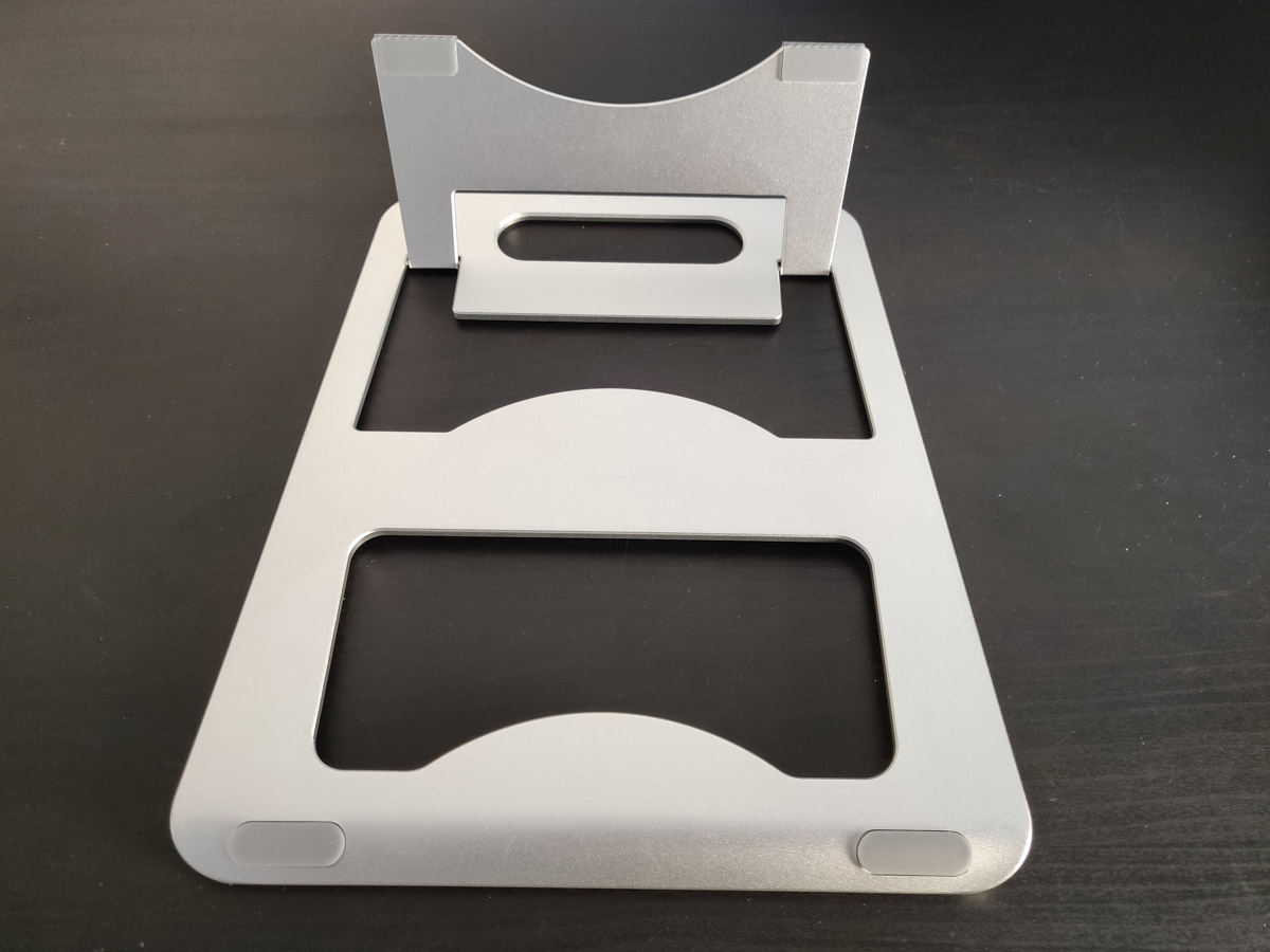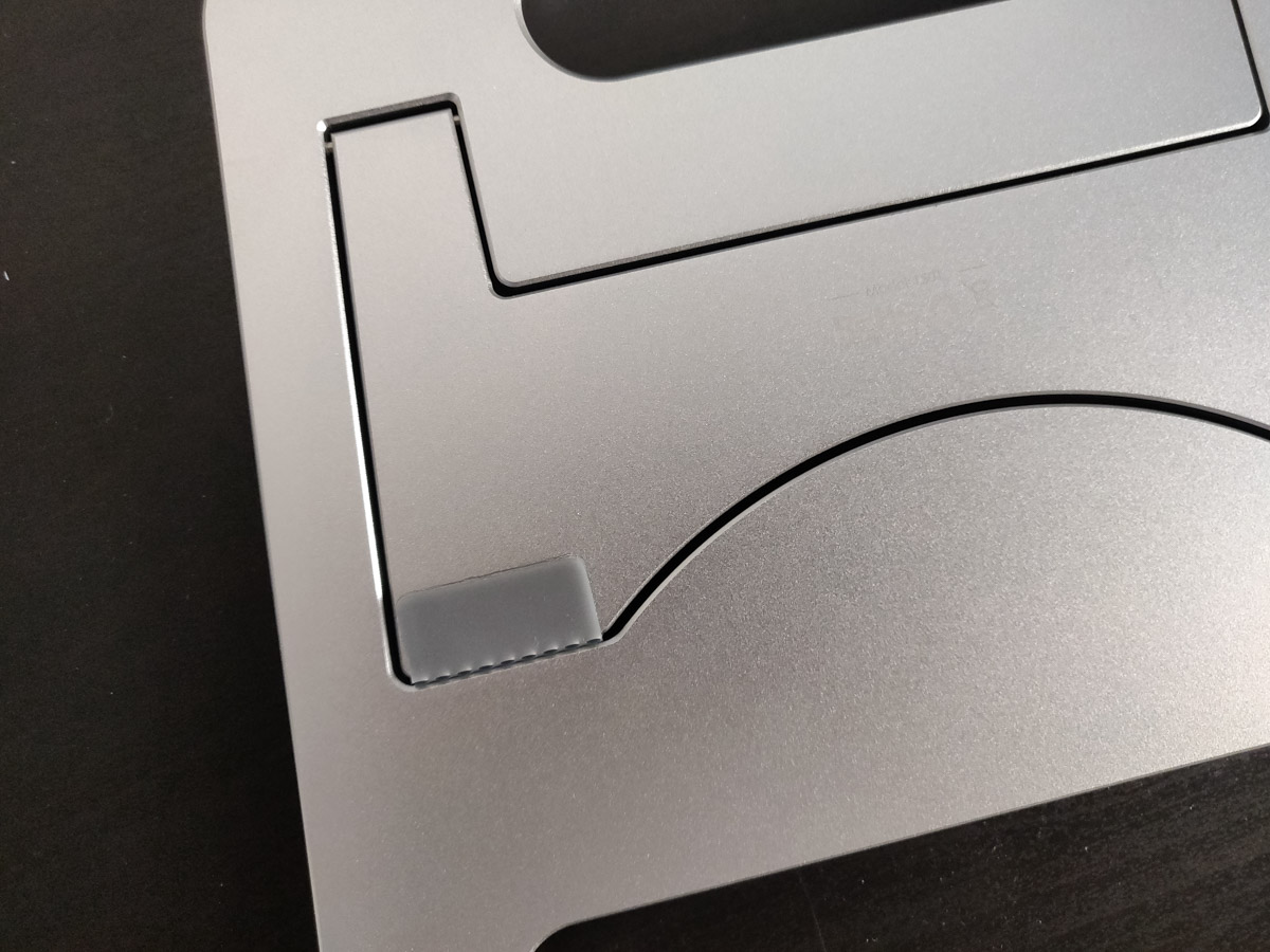 E’ spesso poco meno di un centimetro ed è realizzato interamente in alluminio spazzolato. La struttura è solida e dispone di ampie aperture che permettono di far respirare adeguatamente il computer sostenuto. I punti di contatto con il piano di lavoro e diverse aree sul quale il PC poggia sono rinforzate da ampie coperture in gomma, in modo tale da bloccare sia il supporto sulla scrivania con quattro piedini, sia il computer che praticamente si “incolla” al supporto.