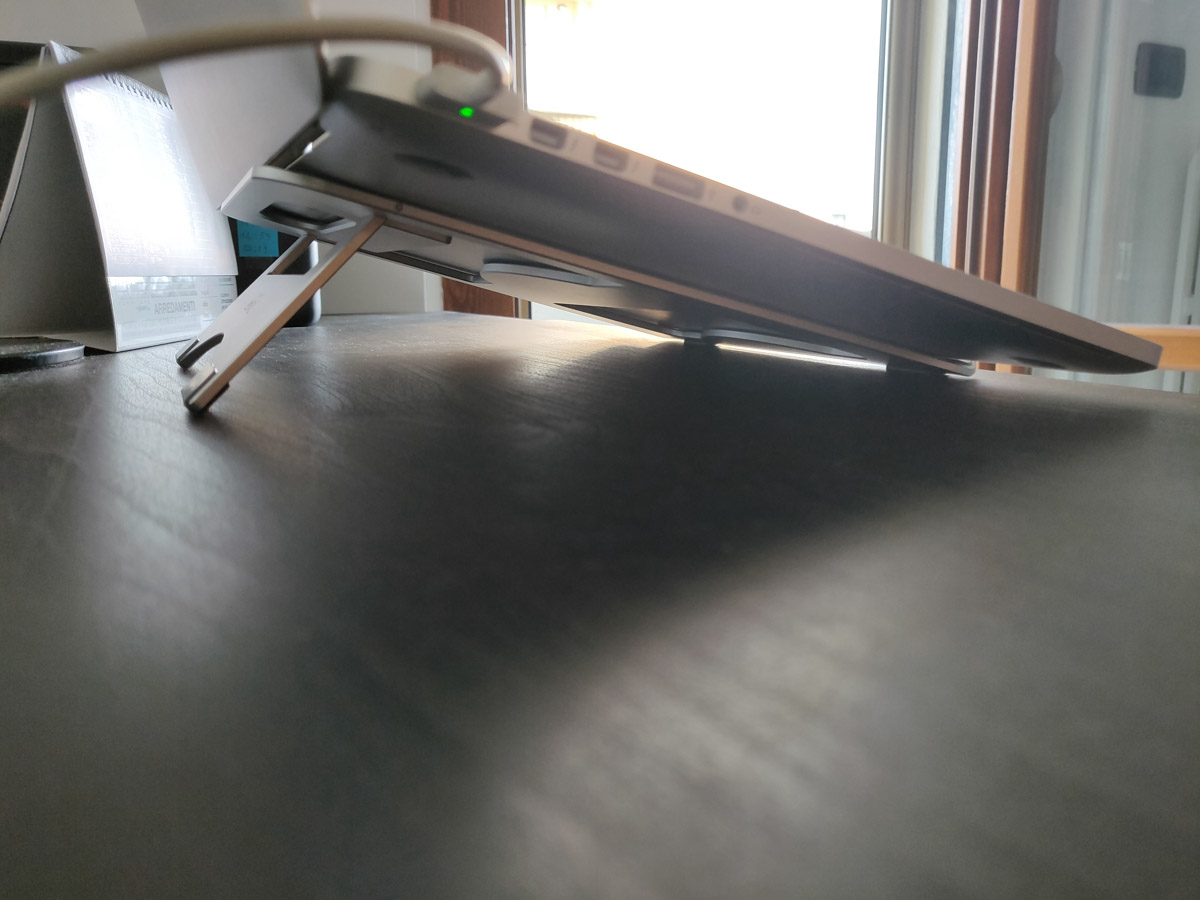 La struttura, come detto, è molto solida e stabile. Lo abbiamo utilizzato con il nostro MacBook Pro 15’’ che non si è mai spostato neanche di un millimetro, proprio grazie alla combinazione del peso con i robusti piedini in gomma.