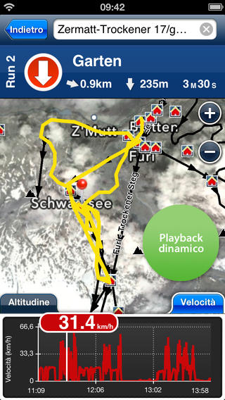 Con Tracce è possibile registrare le nostre tracce: l’utente può scattare fotografie che vengono georeferenziate integranti i geotag. In questa sezione sono anche inclusi gli strumenti per tenere sotto controllo e visualizzare le statistiche di durata, lunghezza, velocità media e massima e anche il dislivello percorso. Una volta a casa è poi possibile rivivere le nostre discese grazie alla funzione di Playback: lo sviluppatore assicura che le tracce delle piste percorse vengono registrate anche in assenza di collegamento cellulare e anche a batteria scarica.