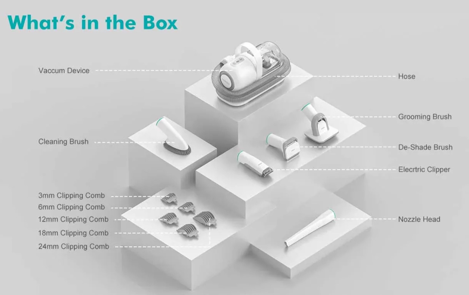 In confezione ci sono diversi accessori: una spazzola cardatore per cani a pelo lungo tendente ai nodi, un Furminator (detto anche spazzola magica) per lavorare bene anche al sottopelo, una spazzola per la pulizia finale e il rasoio, accompagnato una serie di pettini da 3, 6, 12, 18 e 24 millimetri in modo da regolare la lunghezza di taglio del pelo.