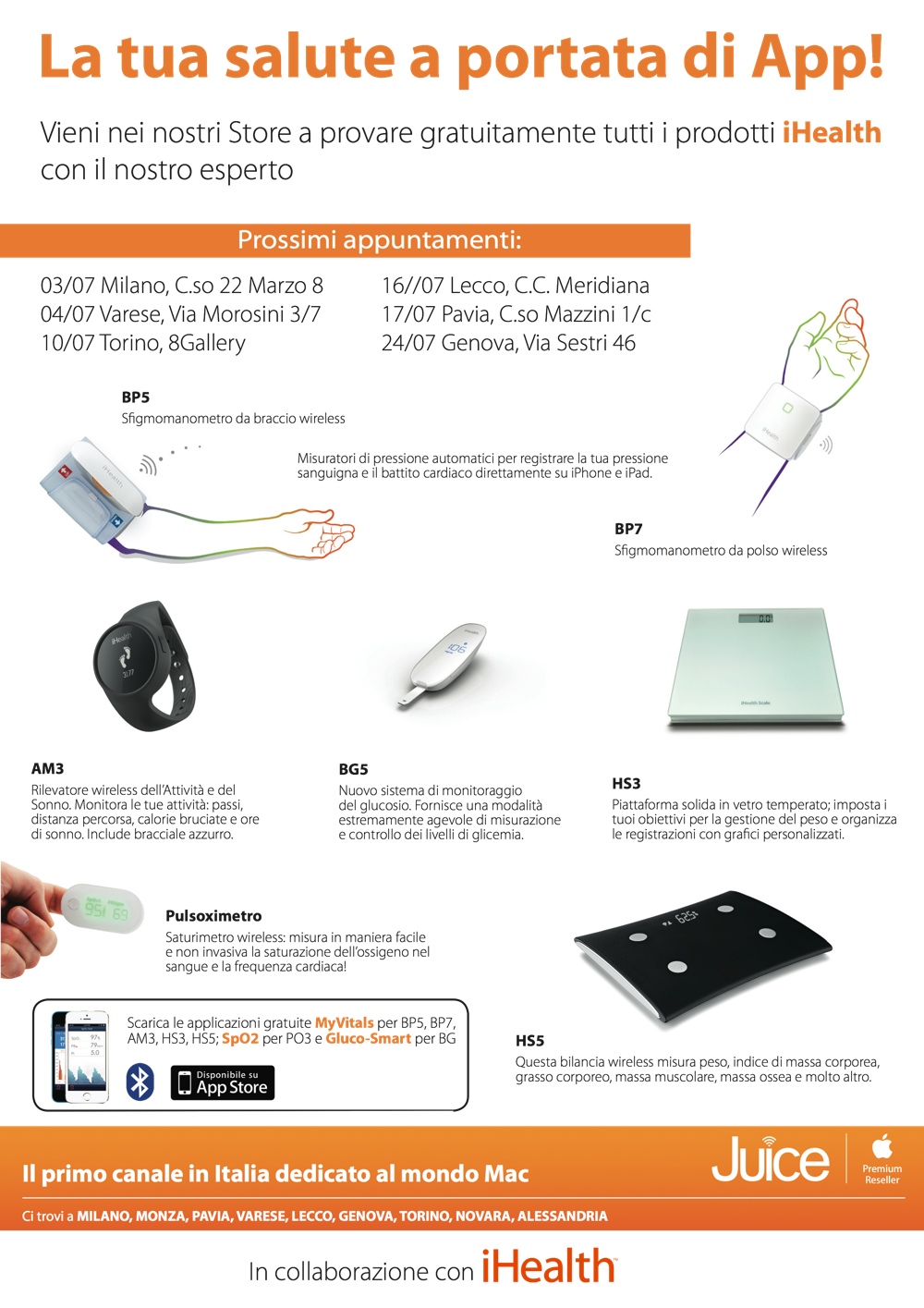 Gli appuntamenti con i dispositivi iHealth nei negozi Juice sono programmati per il 3 luglio nel punto vendita Juice di Milano in Corso 22 marzo 8, il 4 luglio a Varese in via Morosini 3/7, il 10 luglio a torino presso Juice in 8Gallery. Ancora il 16 luglio a Lecco nel Centro Commerciale Meridiana, il 17 luglio a Pavia in Corso Mazzini 1/c e il 24/7 nel negozio Juice di via Sestri 46. Per ulteriori informazioni è possibile visitare questa pagina del sito Juice.