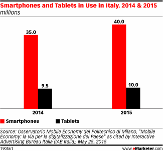 Secondo le previsioni del Osservatorio della Mobile Economy del Politecnico di Milano nel 2015 il numero di dispositivi italiani che si connetteranno da mobile entro la fine del 2015 saranno circa 50 milioni. L’Osservatorio ha riferito che a fine 2014, ci sono stati 35 milioni di smartphone in uso in Italia e 9,5 milioni di tablet. Entro la fine di quest’anno, i numeri dovrebbero raggiungere i 40 milioni per smartphone e 10,0 milioni per tablet.
