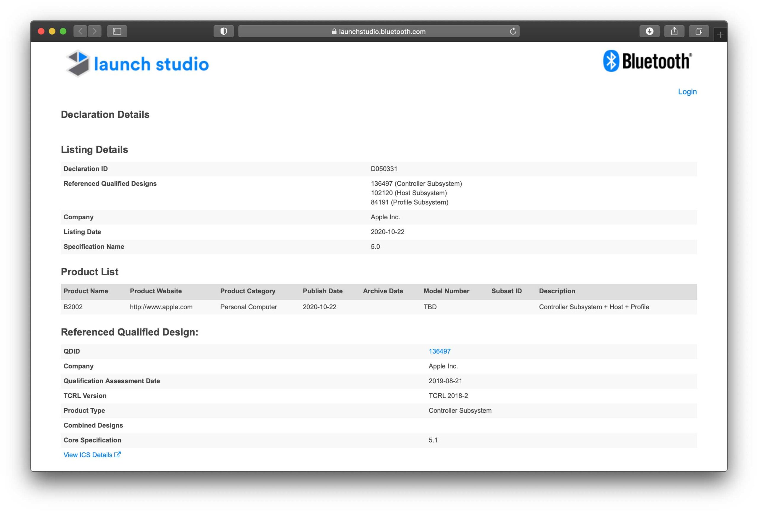 Dettagli nella sezione Qualified Design ID che si possono vedere qui mostrano generiche indicazioni già riportate in precedenti occasioni sia per Mac, sia per iPad. Il prodotto è stato inserito nell’elenco il 22 ottobre ed è il primo inserito pubblicamente in un elenco visibile da chiunque dalla fine del 2019. Macrumors riferisce ad ogni modo che, poiché molti prodotti Apple usano le stesse specifiche Bluetooth, Cupertino ha la possibilità di aggiornare elementi in precedenza inseriti nel database quando nuovi prodotti vengono presentati.
