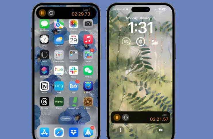 Con un tap sull’isola dinamica è possibile richiamare opzioni per mettere in pausa il cronometro o iniziare un nuovo giro, con controlli simili previsti anche per la schermata di blocco (per i telefoni senza isola dinamica).