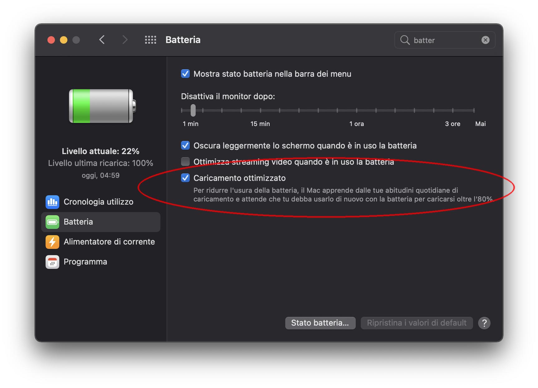 macOS è in grado di ritardare la carica completa al fine di prolungare la durata di una batteria, limitando, in alcuni casi, la carica all’80% prima di passare al 100%. Il Caricamento ottimizzato, spiega Apple, aiuta a ridurre l’usura della batteria e ne aumenta la durata apprendendo le abitudini di ricarica dell’utente. La funzione in questione ritarda il caricamento della batteria dopo l’80% quando prevede che il dispositivo rimarrà collegato per un periodo prolungato e punta a caricare la batteria prima che l’alimentazione venga scollegata. È possibile modificare questa opzione nelle preferenze Batteria.