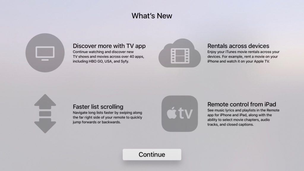 Apple sta da tempo testando tvOS 10.2 ma finora non sono emerse nuove funzionalità particolarmente rilevanti. Alcune novità specifiche di questa release sono indicate dalla redazione di 9to5Mac che ha catturato uno splash screen con indicate alcune delle novità. Tra le novità più interessanti alcune riguardano Apple TV Remote, app finora ottimizzata solo per gli schermi di  iPhone o iPod touch ma che a quanto pare di capire sarà ottimizzata anche per i display degli iPad. Come sempre per usare Apple TV Remote è necessario connettere il proprio dispositivo iOS alla stessa rete Wi-Fi della propria Apple TV. Aprendo Apple TV Remote sul proprio dispositivo iOS si può abbinare la propria Apple TV e controllare i contenuti.