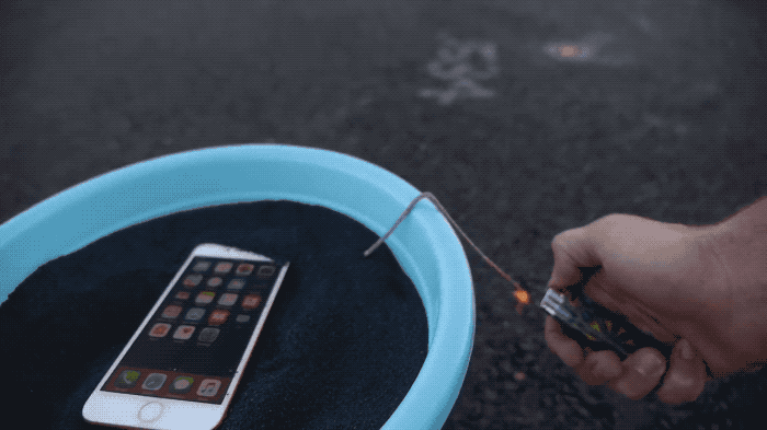 Dopo aver riempito un secchiello da spiaggia con povere da sparo, al posto della semplice sabbia, ed aver posizionato una piccola miccia, è bastato un accendino per dar inizio allo “spettacolo” pirotecnico. Naturalmente, ingrediente fondamentale in questo mix di follia è un iPhone 7 rosso, posto proprio sopra alla polvere esplosiva. In pochi secondi una fiammata avvolge, e scioglie letteralmente, il secchiello, mentre iPhone viene “sparato” a pochi metri di distanza dalla fiamma alta qualche metro.