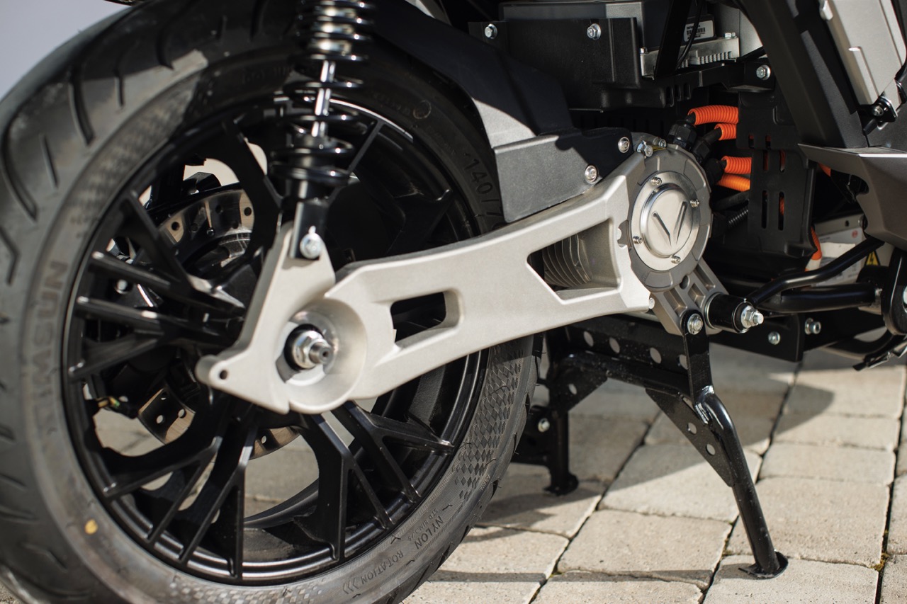 Il moto alla ruota posteriore viene trasmesso in due stadi: primo, da una cinghia dentata a rapporto di trasmissione fisso collegata all’albero motore, e poi da un treno di ingranaggi di riduzione collegati all’albero della ruota. L’elasticità della cinghia di trasmissione aiuta ad ammorbidire e regolare l’erogazione alla ruota della elevata coppia motrice, caratteristica dei motori elettrici.