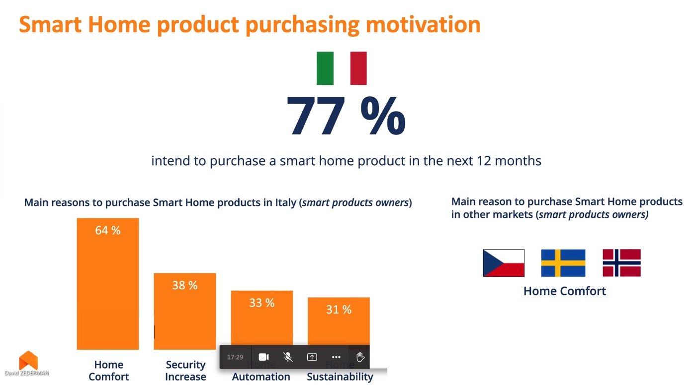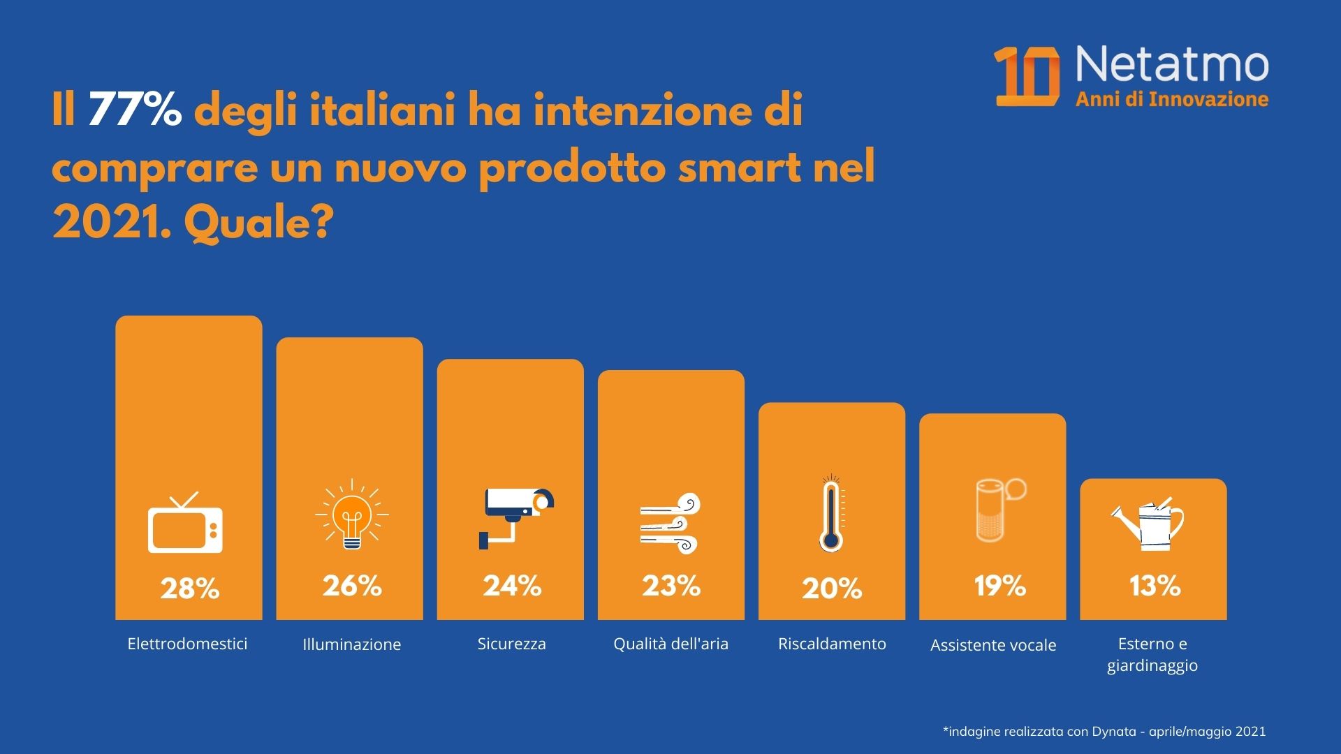 Il 77% di chi ha risposto all’intervista ha dichiarato di voler acquistare un prodotto smart home nel corso di quest’anno: tra i primi posti c’è l’acquisto di un prodotto che aumenti il proprio comfort magari con un elettrodometico o di un sistema d’illuminazione (un quarto circa degli intervistati): a seguire i prodotti per gestione smart della sicurezza, della qualità dell’aria e della termoregolazione.