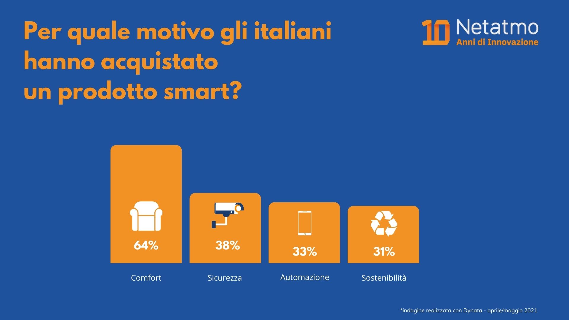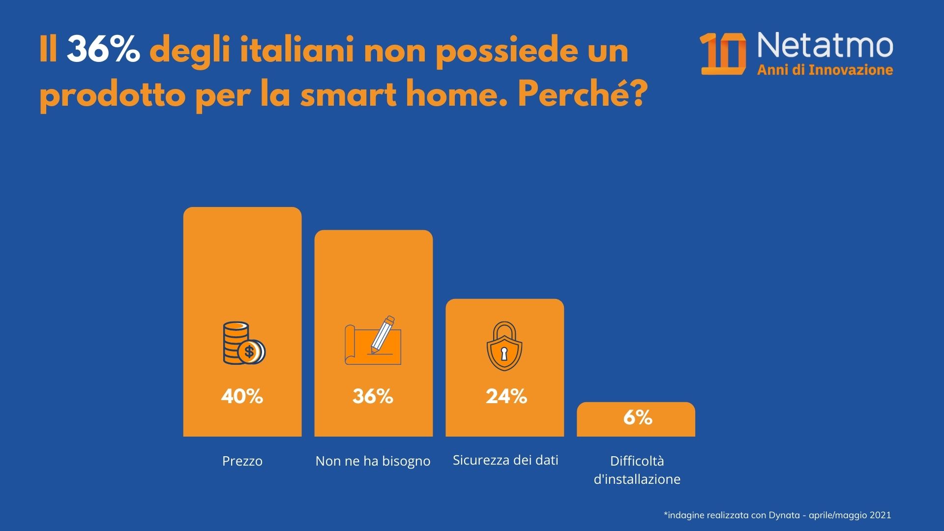 Quali sono i motivi per cui gli intervistati che non hanno prodotti smart affermano di volerli acquistare? Il 36% afferma di non averne necessità, il 40% + spaventato dal costo mentre il 25% è comunque preoccupato per la propria privacy e teme attacchi informatici.