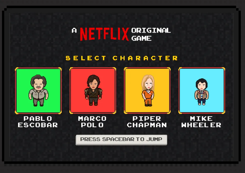 Il gioco è un infinite runner (simile ad esempio a Super Mario Run) molto basilare e con grafica pixellosa tipica degli anni ’80: l’utente potrà interpretare a scelta alcuni dei personaggi più conosciuti delle serie esclusive di Netflix: Pablo Escobar di Narcos, Piper Chapman di Orange Is the New Black, Mike Wheeler di Stranger Things ed anche Marco Polo dell’omonima serie, benchè questa sia stata recentemente cancellata.