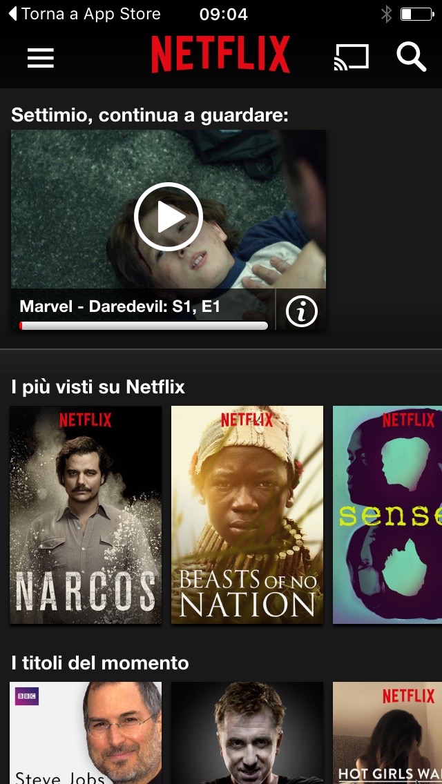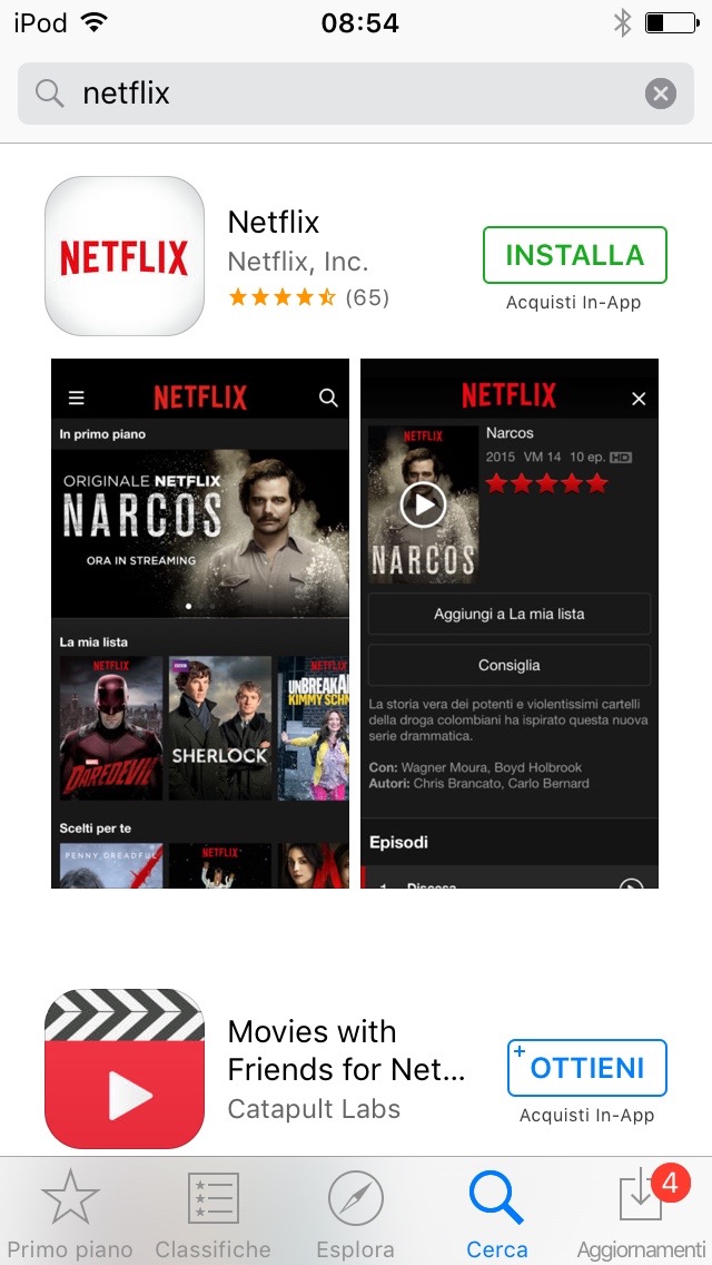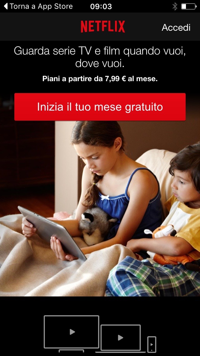 L’applicazione per iOS è gratuita e si scarica da qui. Al primo avvio sarà necessario effettuare il login con l’account precedentemente creato per poter accedere ai contenuti disponibili su Netflix. Installando l’app su tutti i propri dispositivi iOS, tra le altre cose, è possibile visualizzare un contenuto in streaming da uno (esempio: iPhone), metterlo in pausa ed avviarlo poi successivamente da un altro dispositivo (esempio: iPad) riprendendo dal punto esatto in cui era stato interrotto.