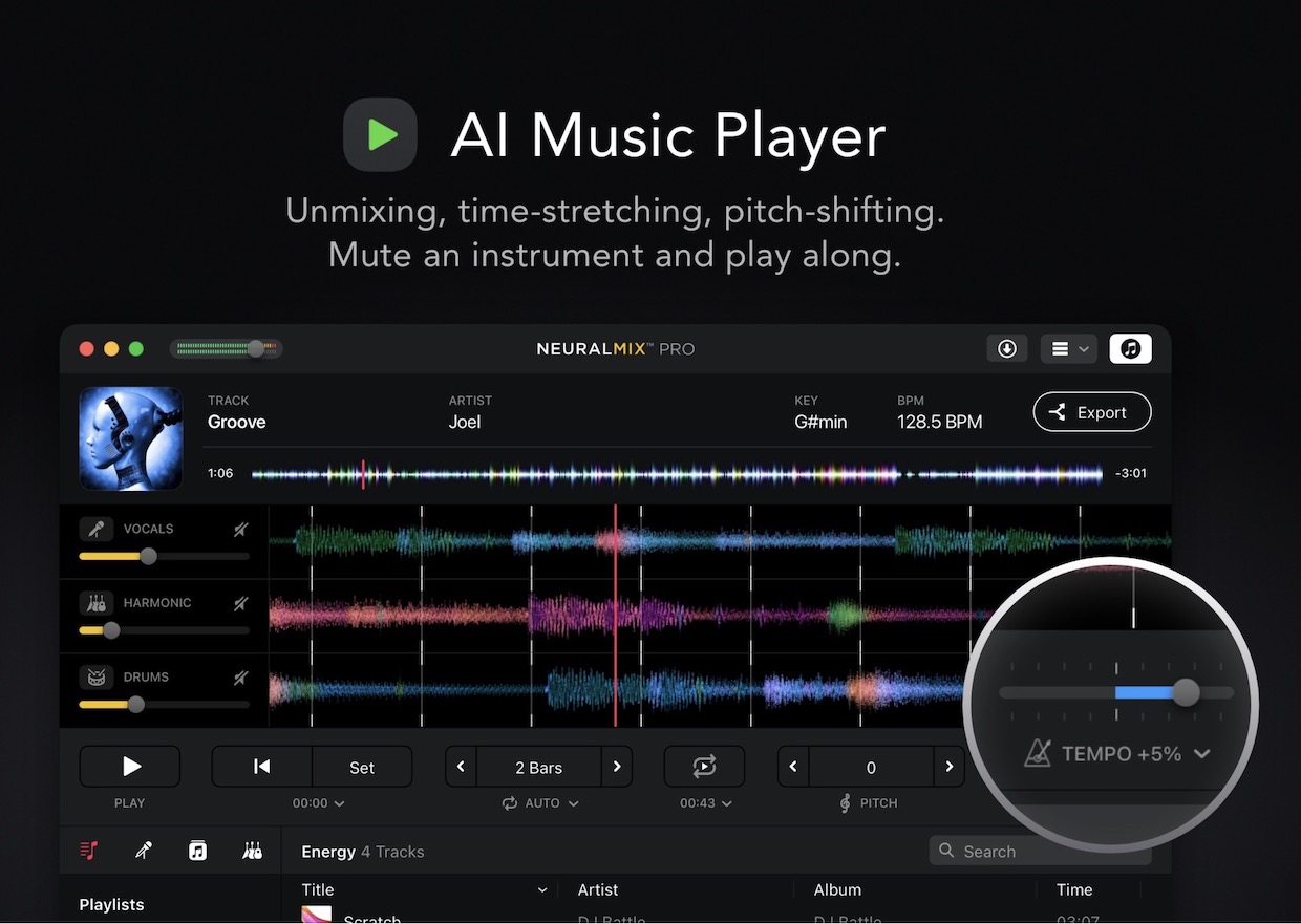 Neural Mix Pro estrae la parte ritmica, strumental e le voci da qualsiasi traccia mettendo in grqdo produttori, DJ e musicisti di creare loop precisi al singoli bit, cambiare e tempo e tonalità e allo stesso tempo rimuovere in tempo reale le parti che non interessano o esaltare quelle che vogliamo riutilizzare. L’opzione di esportazione offline permette di estrarre le parti accappella e strumentali con una elevata qualità del suono.