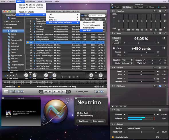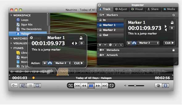 Neutrino è un player commerciale (29,95$) in precedenza conosciuto come “AudioCodex” con funzionalità di riproduzione avanzate che non si trovano facilmente in altri software. L’applicazione consente di aggiungere in tempo reale effetti, riverbero, loop, controllare (aumentare o diminuire) il pitch e può essere espansa con plug-in Audio-Unit. E’ possibile impostare, salvare e richiamare impostazioni diverse per ogni traccia ed evidenziare zone con marker multipli e fare in modo che al raggiungimento di una zona sia eseguita una particolare azione.