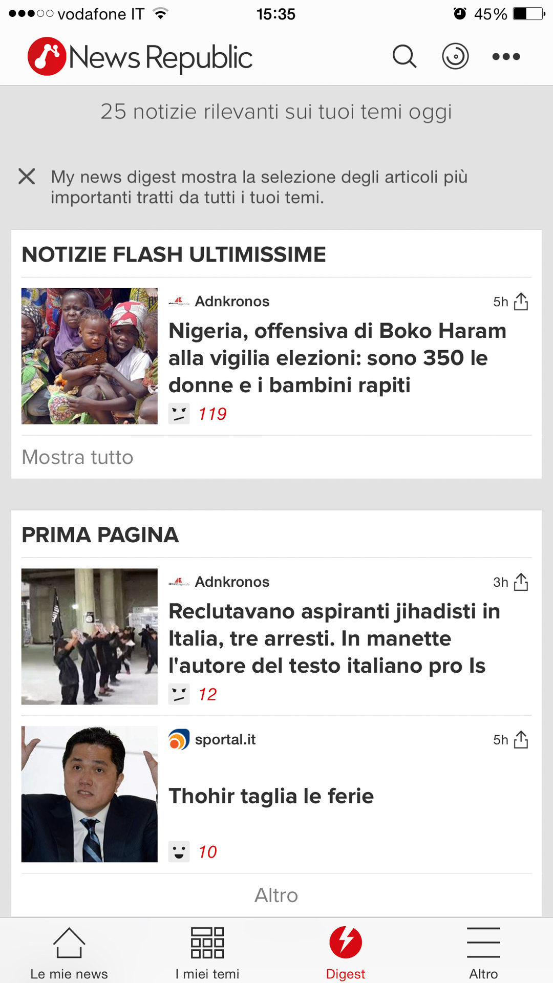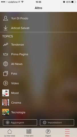 Il My News Digest, precedentemente accessibile tramite swipe dal menù laterale (ora sparito), conquista la terza casella nella nuova barra di menù, raccogliendo le 30 notizie più rilevanti della giornata basandosi sui temi dell’utente. Il quarto ed ultimo pulsante, denominato Altro, raccoglie il profilo utente, gli articoli salvati, le varie categorie ma soprattutto, oltre al pulsante per regolare le Impostazioni, compare una nuova scheda, denominata Tendenze, all’interno della quale troviamo articoli e temi più visti e condivisi dai lettori.