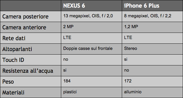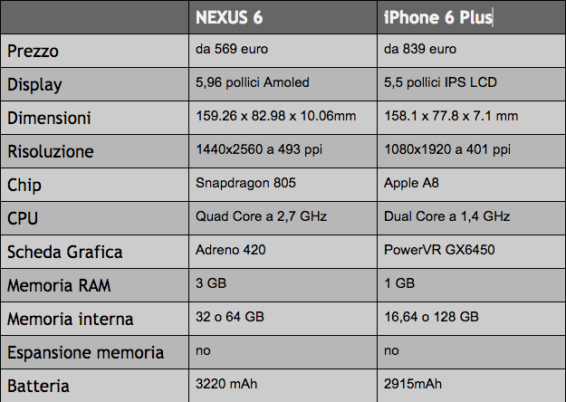 Nexus 6 è ormai realtà, anche se ancora non in vendita e non presente, nemmeno in pre order, sul Google Play Store italiano. Ad ogni buon conto, come inevitabile che fosse, in rete si susseguono i primi confronti. Naturalmente, date le dimensioni del nuovo phablet Google, che vanta un display con diagonale da 6 pollici, non potevano mancare articoli di approfondimento con tematica Nexus 6 contro iPhone 6 Plus. Di seguito, un confronto tra i due terminali, quanto a caratteristiche, dimensioni, display e ulteriori informazioni tecniche apparse in rete, o dichiarate ufficialmente dai due produttori.